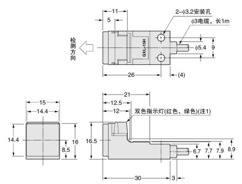 接近時ON型中配備: 穩定檢測狀態下綠色LED亮起 不穩定檢測狀態下紅色LED亮起 |
