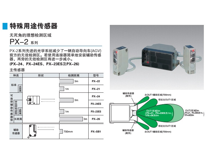 PX-2列先進的光學系統減少了一輛自動導向車(AGV)前方的無效檢測區。若使用連接器簡單地安裝輔助傳感器,兩旁的無效檢測區將進一步減小。