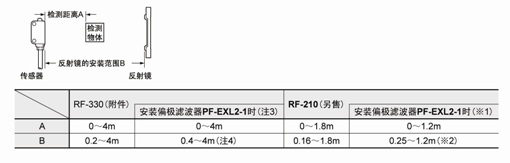 回歸反射型傳感器的檢測距離是相對于反射鏡RF-330的數值。此外,檢測距離表示檢測物體的可檢測范圍。下表中的檢測距離A因檢測物體的形狀等不同,可能發生變化。 請務必使用實際的檢測物體進行動作確認。![]() ※1::關于偏極濾波器PF-EXL2-1、反射鏡RF-210,請參照選件。 ※2::近距離安裝反射鏡的情況下,角度特性會變狹窄。請對傳感器或者反射鏡的角度進行微調。 |