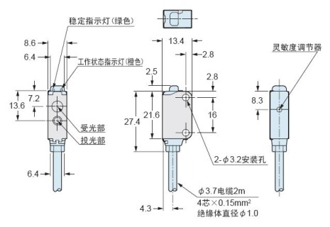 | 電纜 | 0.15mm2 4芯(透過型的投光器為2芯)帶橡皮絕緣電纜2m | ||