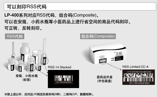 LP-400系列對應RSS條形碼、和組合碼(Composite)。