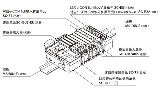 一般的通用傳感器與連接器輸入單元SC-A01、SC-A02、SC-E1、SC-E81、SC-E82相連后,也可連接到SC-GU3系列上。進一步實現(xiàn)省配線。
