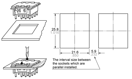 To install the socket easily, insert the socket top surface into the drilled holes and press the two points on the fastening plate indicated by arrows as shown in the fig. below.