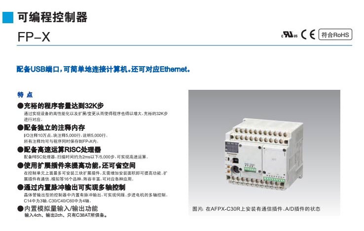 配備標準USB端口。高程序容量32K步,可充分確保注釋區域。Tr.輸出為脈沖輸出,內置4軸。