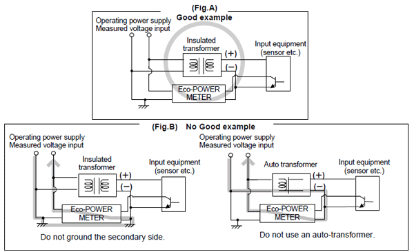 ※因為操作電源(測量電壓)輸入部和脈沖輸入部沒有絕緣,連接各種信號輸入的時候,為了防止短路,互感器等輸入機器的電源,像圖A那樣1次、2次的絕緣電壓變壓器下,請使用沒有2次側接地的狀態。在2次側接地的狀態,或者使用單個變壓器的時候,有可能會像圖B那樣短路,損壞了商品內部的回路。