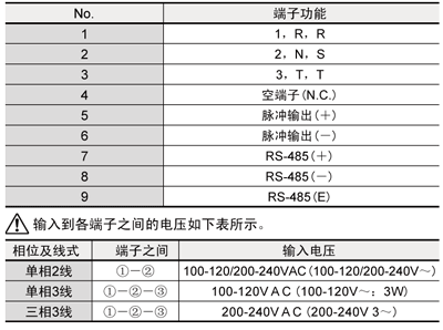 • 2.電壓輸入端子(No.1、2、3)的配線請使用截面積為0.14~1.5mm2(AWG#26~14)的電線(剝離線長度為7mm),脈沖輸出端子(No.5、6)的配線請使用截面積為0.14~1.0mm2(AWG#26~16)的電線,通信端子(No.7、8、9)的配線請使用截面積為0.3~1.0mm2(AWG#22~16)的電線(剝離線長度為5mm)。在通信端子上連接2線的情況下,請使用截面積為0.3~0.34mm2,且尺寸相同的兩根電線(剝離線長度為5mm)。