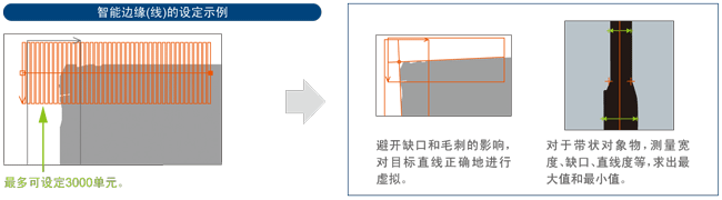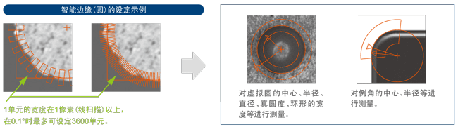 正確地虛擬于圓、線。在1個區域內,圓的邊緣點最多可檢測到3600點,而線的邊緣點最多可檢測到3000點,從而飛躍性地提高了精度,可進行尺寸、位置測量。同時,大幅度地削減了設定工時。