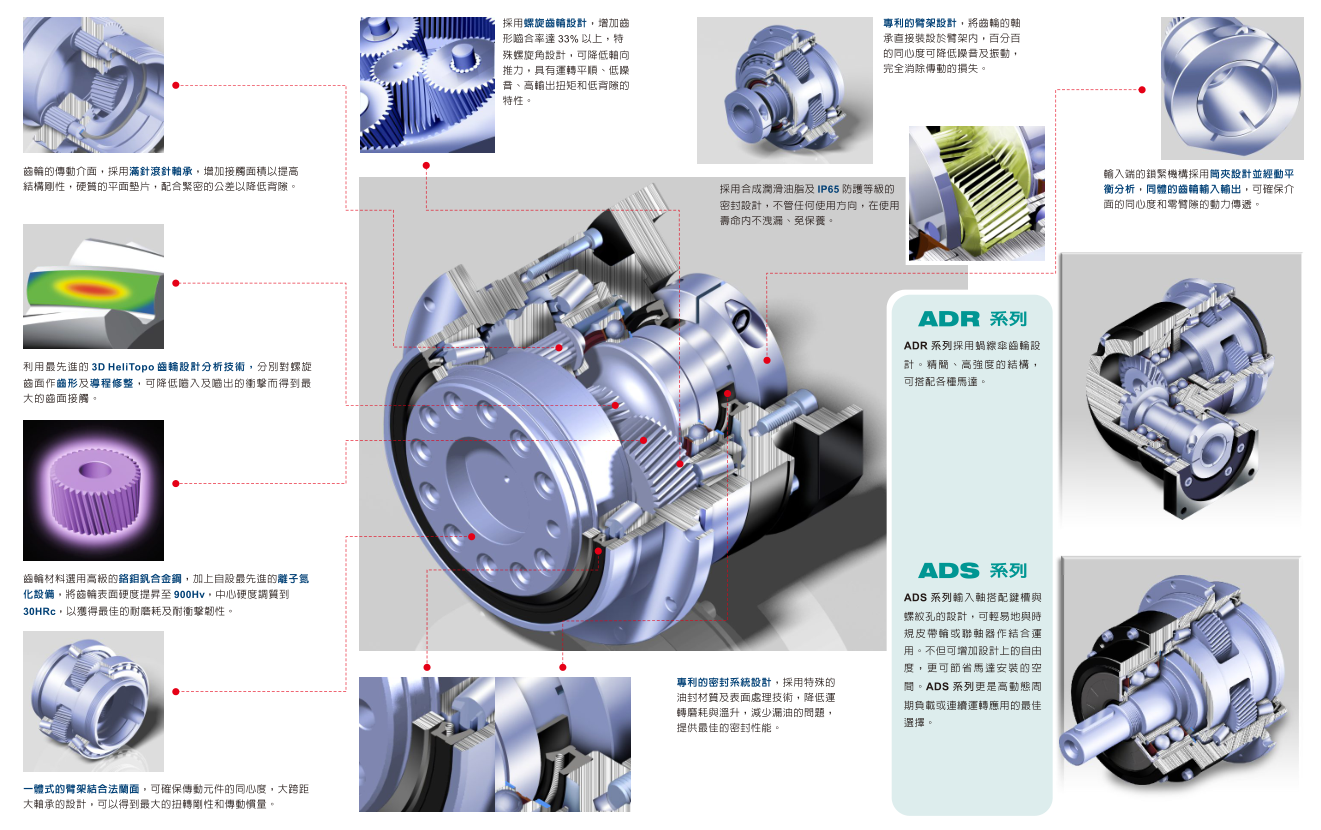 螺旋齒輪設(shè)計;筒夾式的鎖緊機構(gòu);專利的臂架設(shè)計;一體式的齒輪箱本體;一體式的臂架;先進的離子氮化技術(shù);3D拓蹼的設(shè)計分析技術(shù);滿針的滾針軸承設(shè)計;專利的油封系統(tǒng)設(shè)計