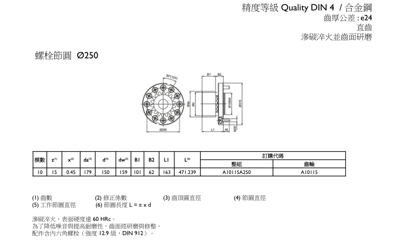APEX臺灣精銳直齒齒輪(曲齒聯結式 / EN ISO 9409-I-A) 精度等級 Quality DIN 4 / 合金鋼 螺栓節圓Φ250 (模數M:10)