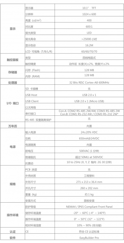10.1" 1024 x 600 TFT LCD, LED 背光, 無(wú)風(fēng)扇冷卻系統(tǒng), 內(nèi)置儲(chǔ)存內(nèi)存及萬(wàn)年歷, 支持 USB Host 與 USB Client, COM2及COM3的RS-485 2W 支持 MPI 187.5K,但同時(shí)間只能擇一使用, 內(nèi)建電源隔離。