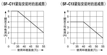 多個(gè)SF-C11或SF-C13并排使用時(shí),請(qǐng)將單元的間隔控制在5mm以上。緊貼安裝時(shí),使用環(huán)境溫度與安全輸出的額定動(dòng)作電流的關(guān)系請(qǐng)參閱下圖。