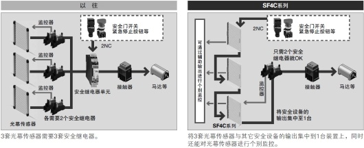 光幕傳感器本體上可以連接緊急停止開關、安全門開關等的輸出接點。此外,使用手動控制器SFC-HC,可以對3套光幕傳感器進行跨接配線,同時對安全輸出進行集中控制。 |